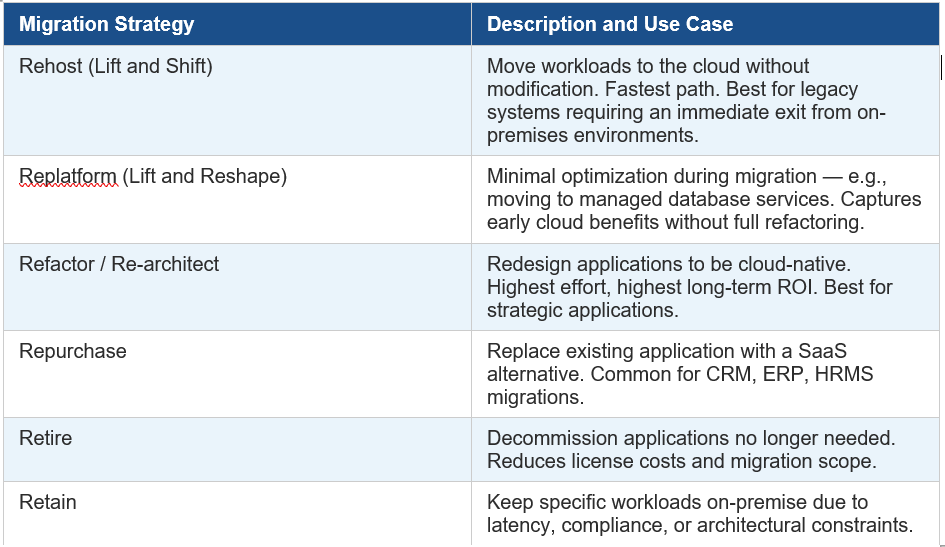 The industry-standard framework for classifying migration strategies, known as the 6 Rs, outlines the approach for each workload: